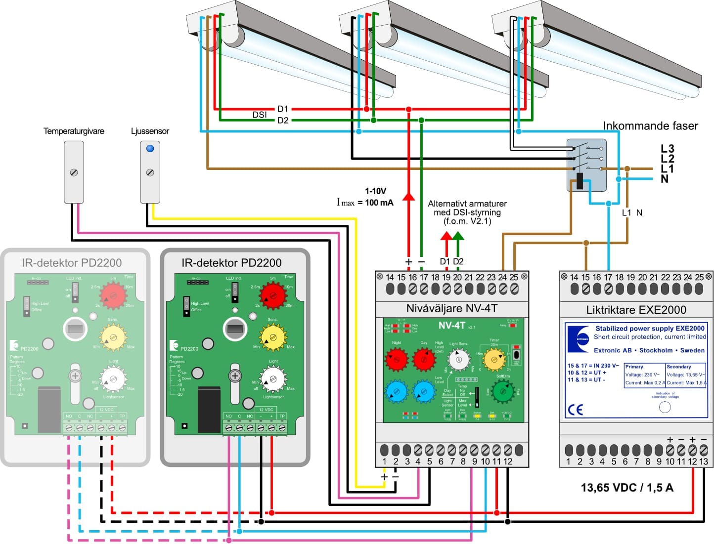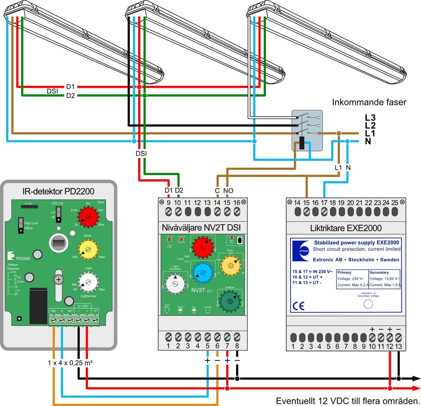 I de flesta fall behöver man endast byta ut centralenheten mot en Nivåväljare NP2T DL, som fungerar mot DALI-armaturer. I denna broschyr har vi tagit med några exempel på hur äldre anläggningar kan se ut och man kan göra för att uppgradera dom.