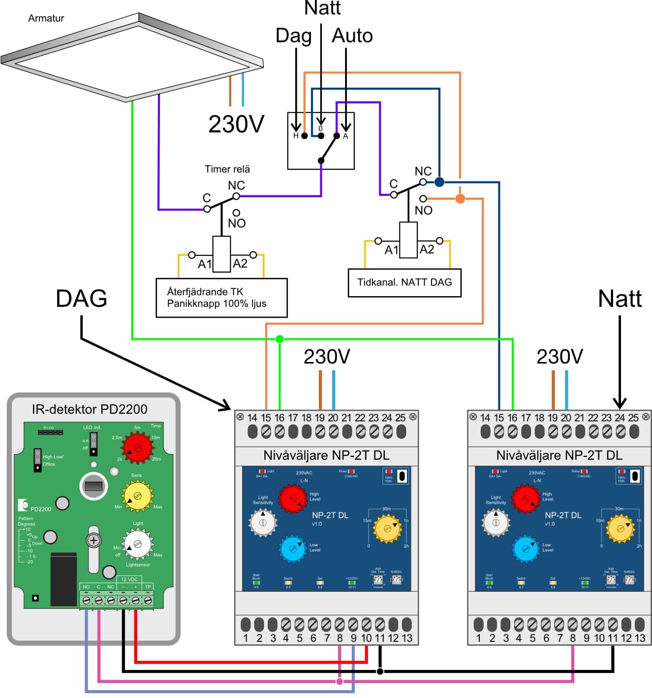 Vi har många applikationsexempel med NP2T DL. Till exempel kan du få ett konstant grundljus under vissa tider genom att koppla ett 22k ohms motstånd mellan plint 6 och 7 och seriekoppla det med en tidkanal.